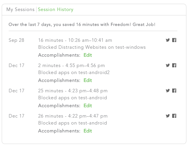 В разделе Session History можно посмотреть данные по завершённым сессиям, добавить к ним достигнутые задачи.