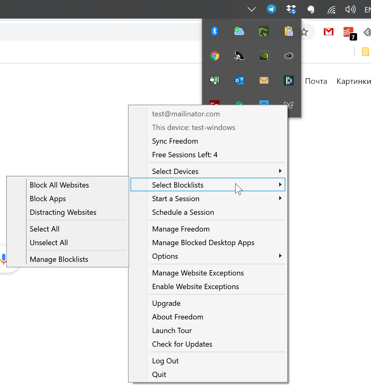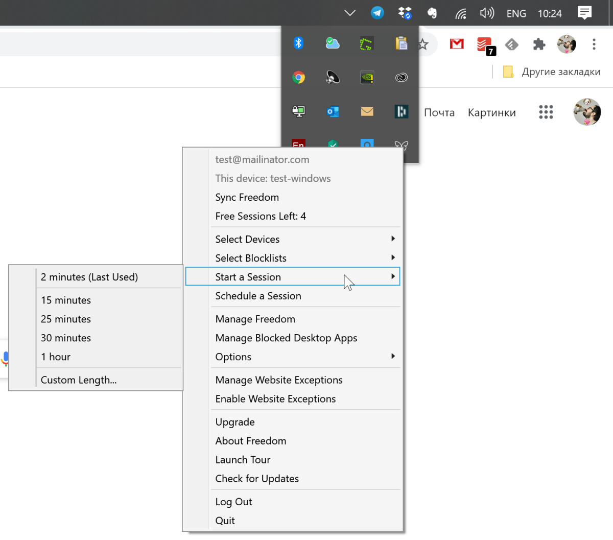 Для этого в контекстном меню Freedom нужно выбрать категорию блокировки, а затем запустить сессию.