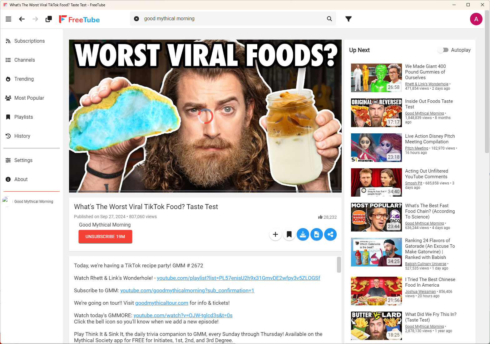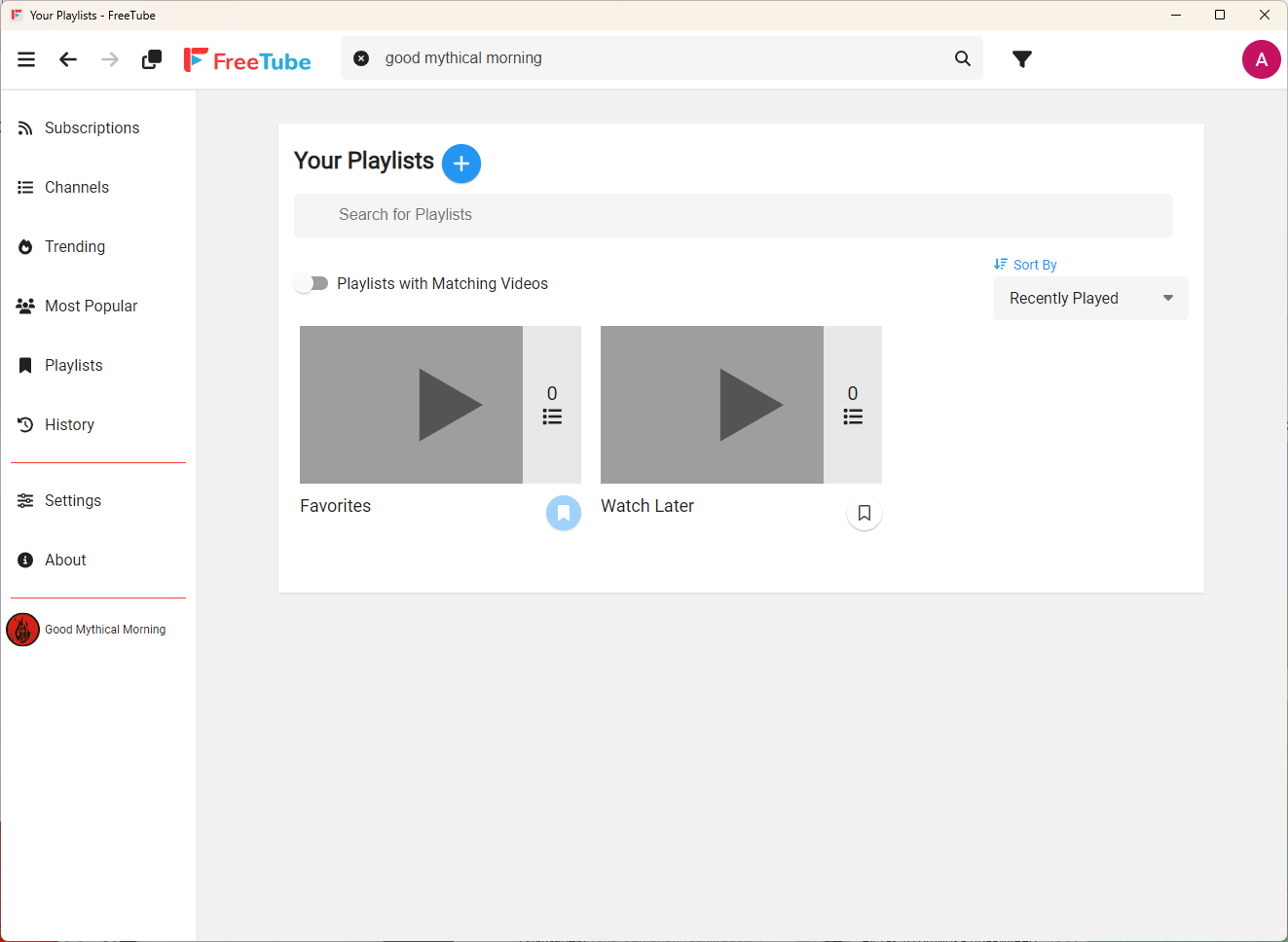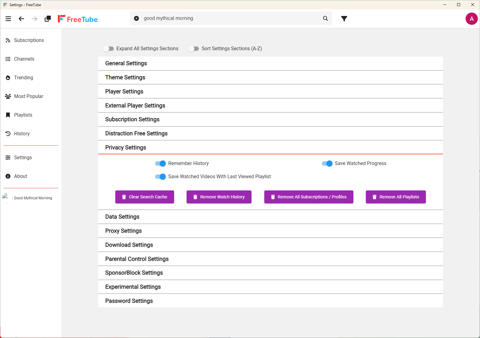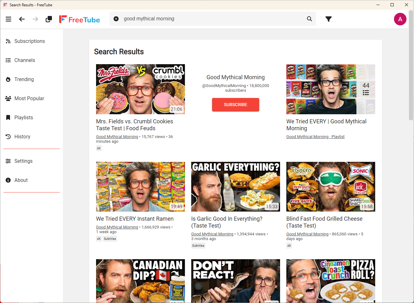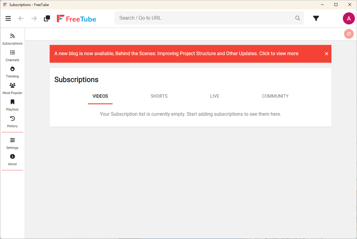 Из названий уже понятно, для чего служит каждый раздел, а с точки зрения функциональности они соответствуют обычной веб-версии YouTube. Хотя бы потому, что FreeTube просто открывает внутри себя обычный YouTube.