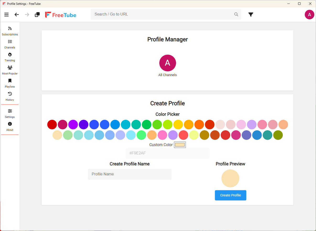 Чтобы как-то можно было работать с подписками, плейлистами и историей просмотров, FreeTube предлагает создать свой локальный профиль с аватаром и именем. Причём таких профилей может быть несколько, и вы можете иметь различные подписки в каждом из них.