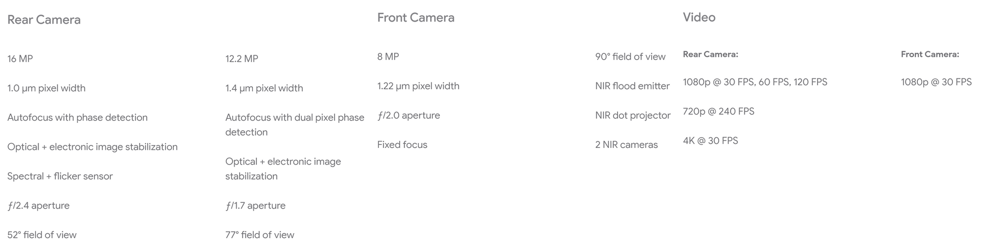 Ниже вы можете увидеть все спецификации камер. Как видно, есть улучшения в мегапикселях, оптике и вообще количестве камер. Есть и очевидные ухудшения. Где широкоугольная камера, Google?