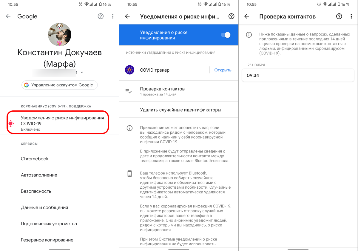 На Android для этого нужно войти в управление аккаунтом Google, и в пункте Уведомления о риске инфицирования COVID-19 появится надпись Включено.