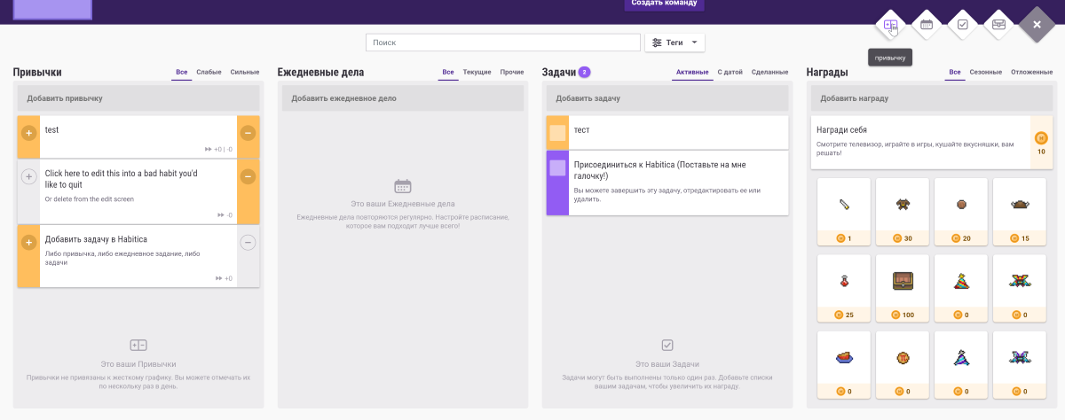 К сожалению, в Habitica нельзя создавать свои доски. Либо я не нашёл как. Поэтому вам даётся четыре списка для работы: Привычки, Ежедневные дела, Задачи и Награды.