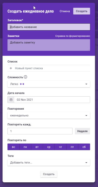 В целом, для первых трёх досок всё достаточно привычно. Вы можете создавать повторяющиеся задачи с датами начала, списками, заметками, периодами повторения и тегами. Аналогом энергии, затрат или приоритетов в Habitica служит выпадающий список Сложность.