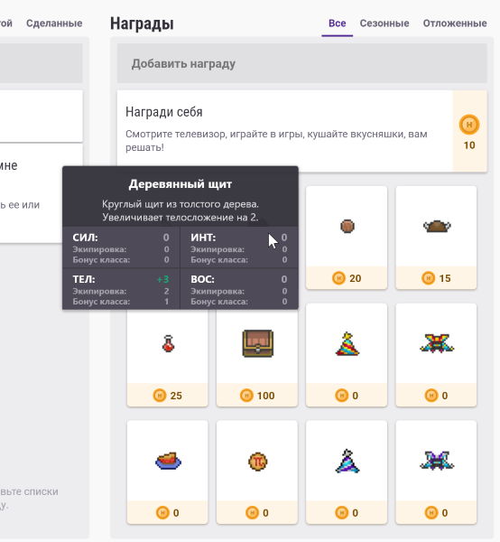 Выглядит очень уныло. Гораздо интереснее пользоваться наградами от самой Habitica. У каждой награды есть своё описание и различные бафы или дебафы для вашего персонажа.