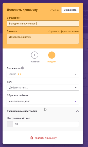 Теперь при каждом выполнении такой задачи-привычки ваш персонаж будет терять здоровье. Пополнить здоровье можно полезными привычками, переходом на новый уровень или выпив лечебный эликсир.