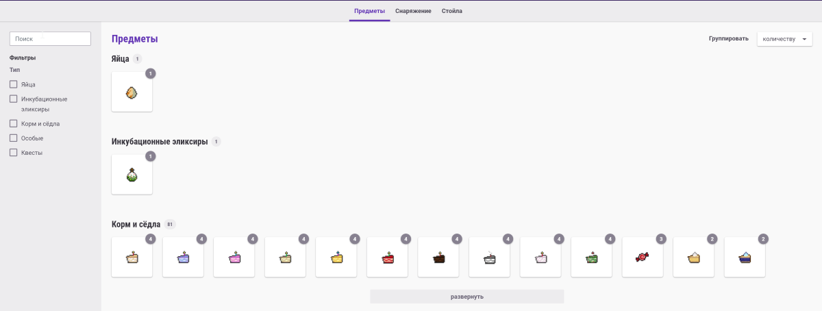 На вкладке Инвентаря можно просмотреть все накопленные предметы, снарягу и пройтись по вашим стойлам.