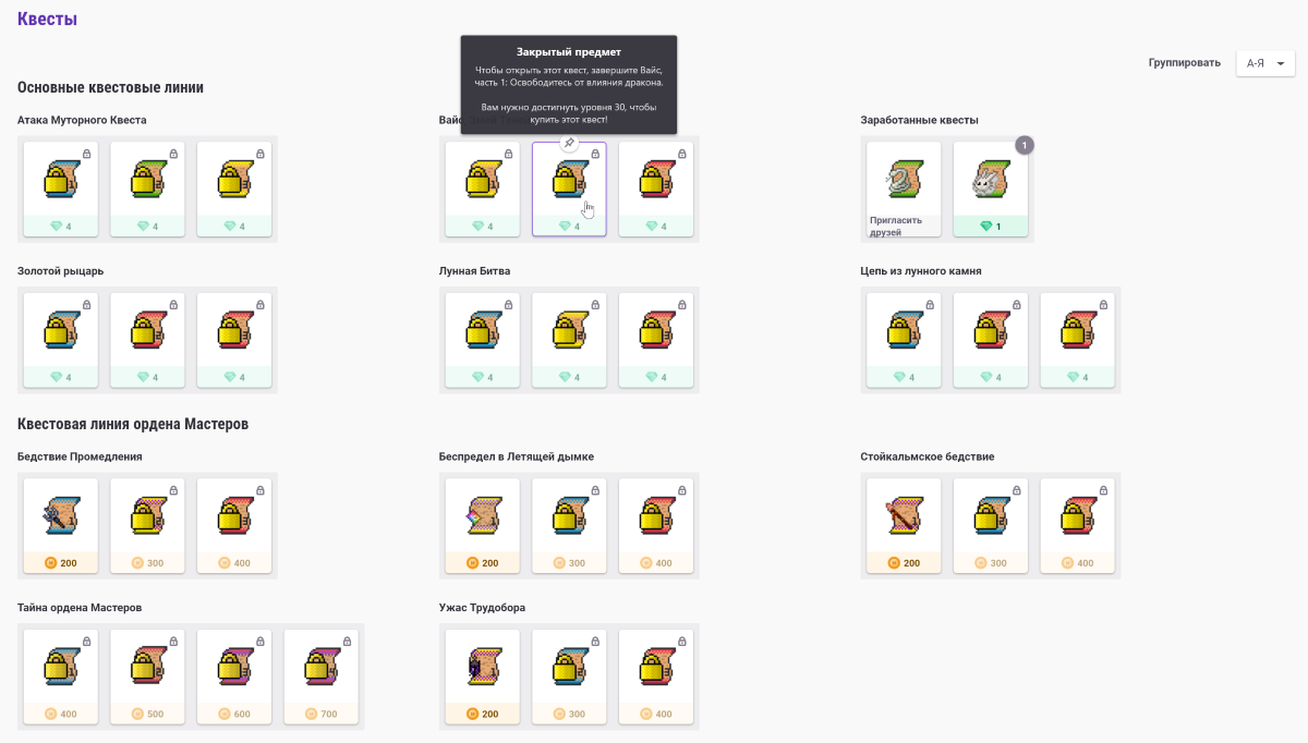 Здесь же можно получить квесты. Доступность заданий зависит от вашего уровня и накопленных монет. Есть основные квесты, квесты на эликсиры и питомцев, квесты линии мастеров.