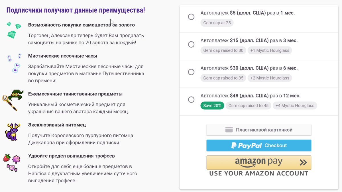 Habitica — бесплатная игра и GTD-сервис. Оплата служит вашей финансовой благодарностью разработчикам. И вы можете выбрать автоплатёж от $5 в месяц до $48 в год.