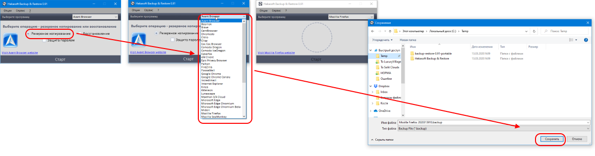 Сам процесс сохранения данных очень простой. Нужно нажать кнопку Резервное копирование, выбрать браузер и папку для сохранения файла.