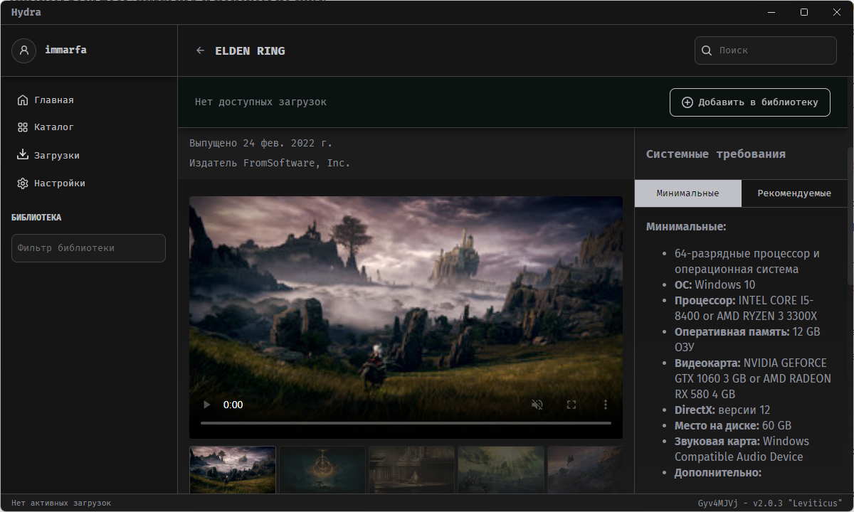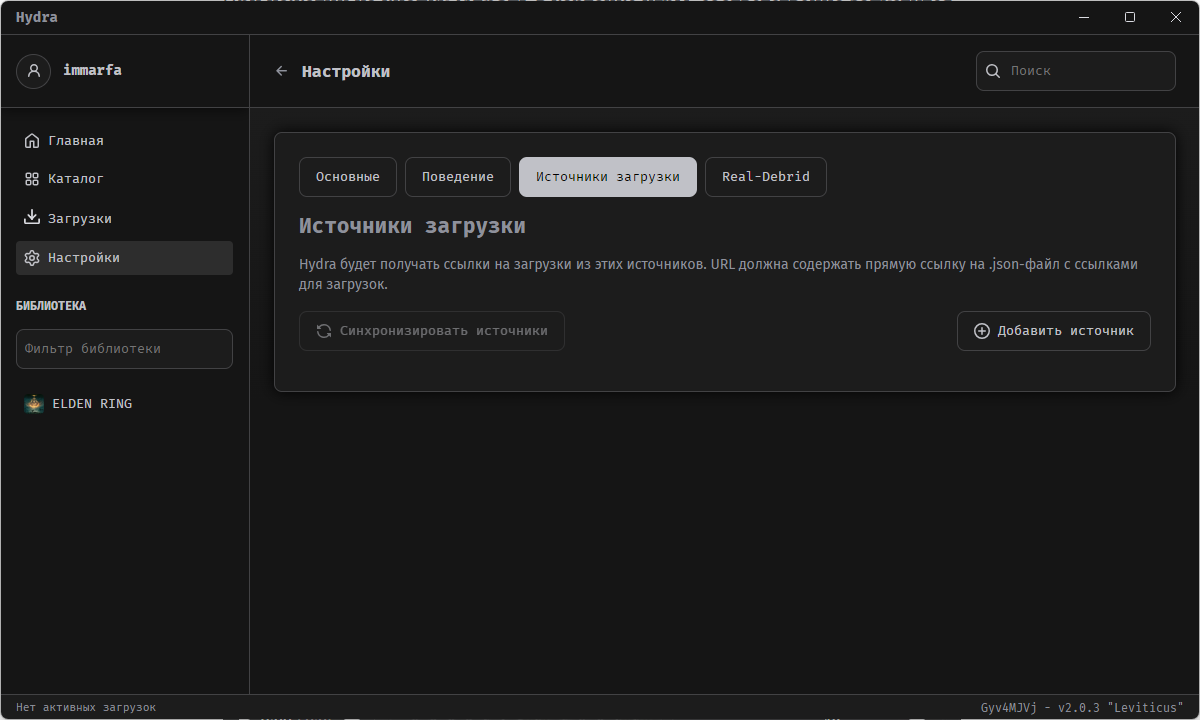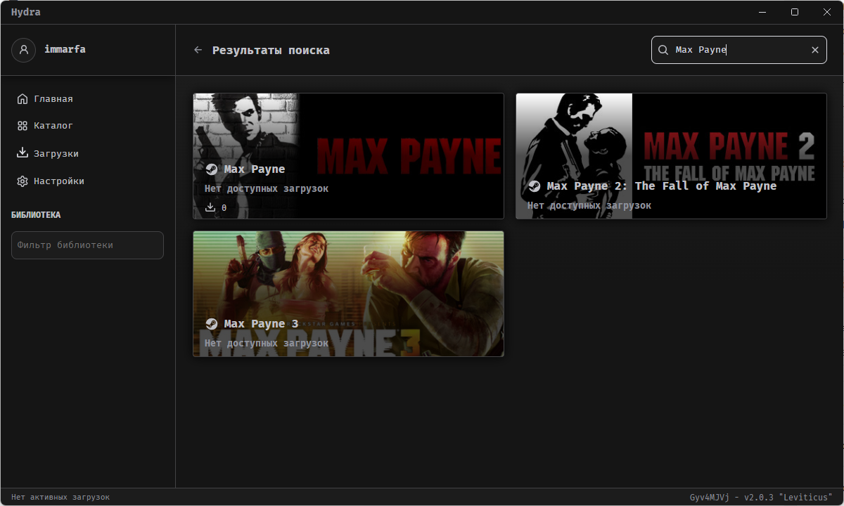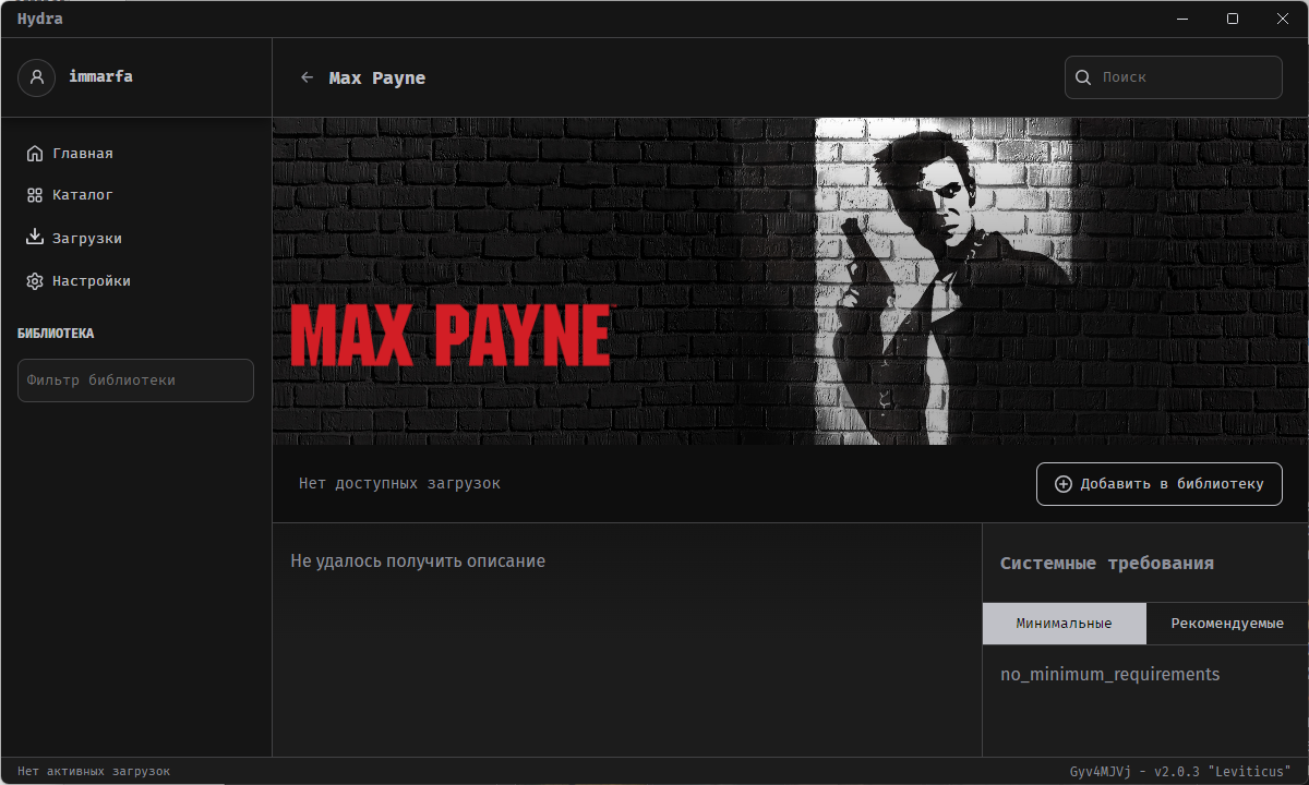 Поначалу может показаться, что скачать какую-то игру вообще невозможно. Hydra для скачивания игр использует встроенный клиент libtorrent, но вот откуда она берёт игры — не сразу понятно. У всех игр на главной красуется надпись «Нет доступных игр».