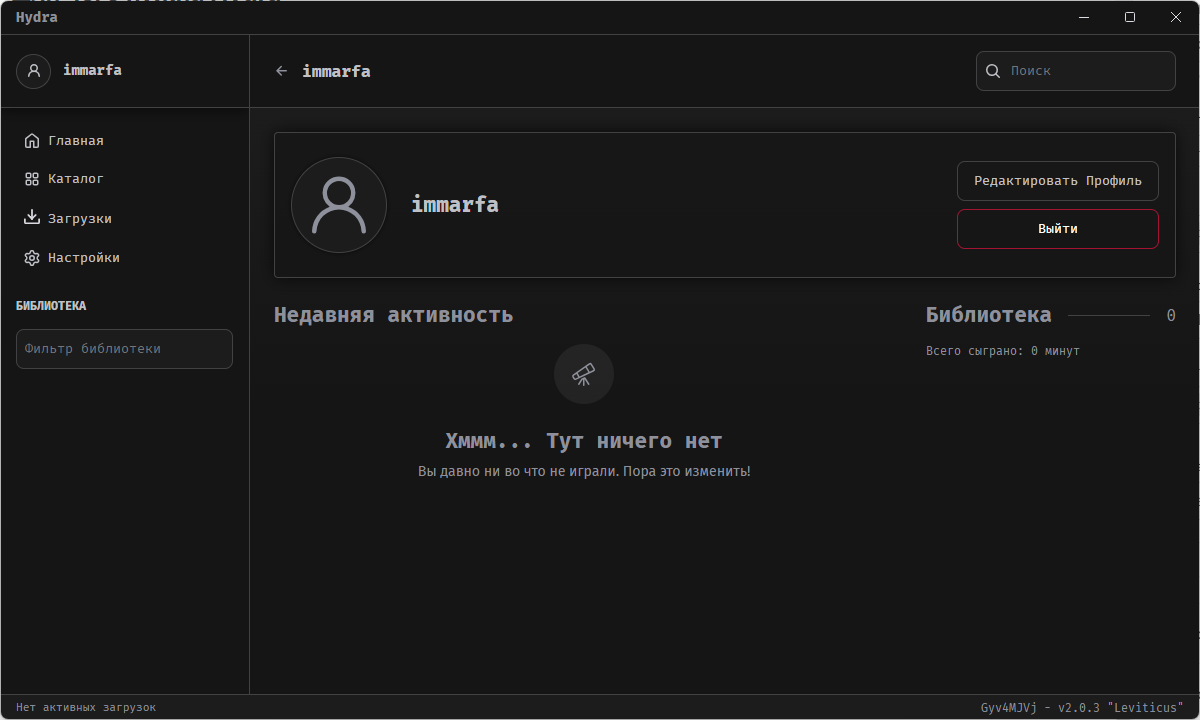 Как и в любом уважающем себя лаунчере, в Hydra можно создать свой аккаунт для синхронизации данных о библиотеке между устройствами. Регистрация анонимная и совсем не обязательная. А данные в библиотеке заполняются автоматически на основе запущенных игр или добавленных вручную. По библиотеке так же доступен поиск (и тоже без фильтра).