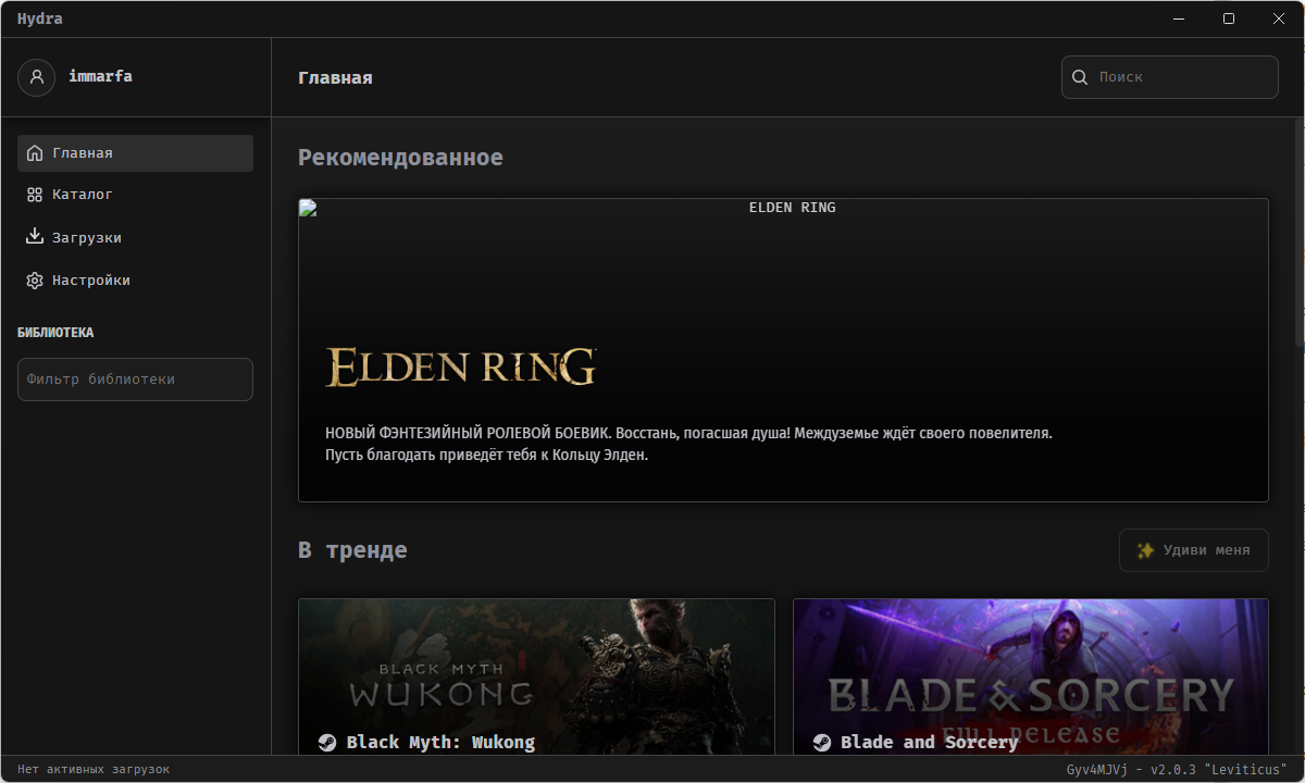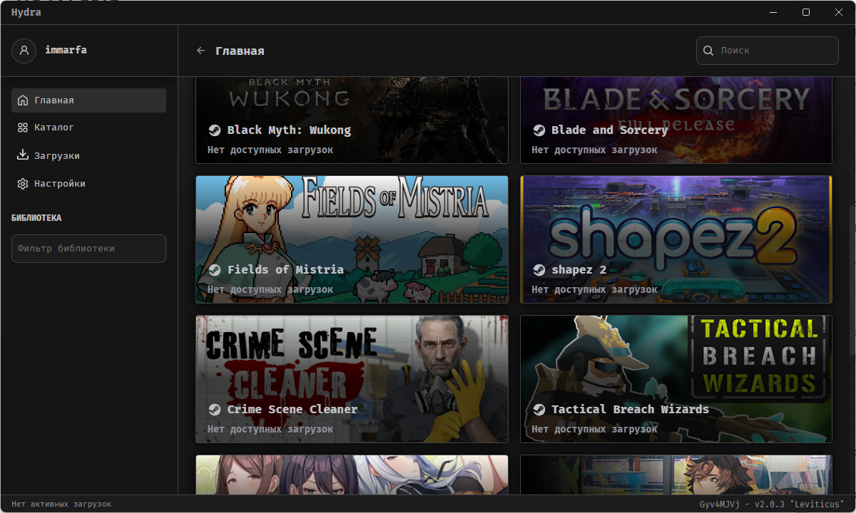 Если вы пользовались Steam или другими магазинами игр, в Hydra вы почувствуете себя как дома. Здесь точно так же есть Главная страница со списком всех доступных игр и поиском по ним.