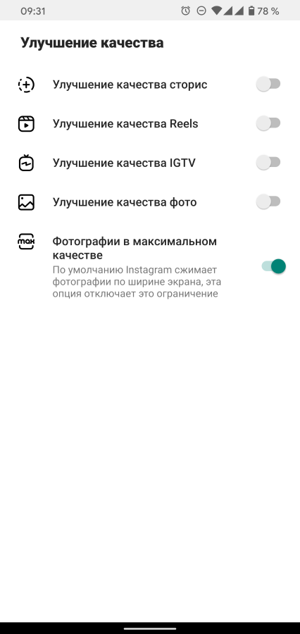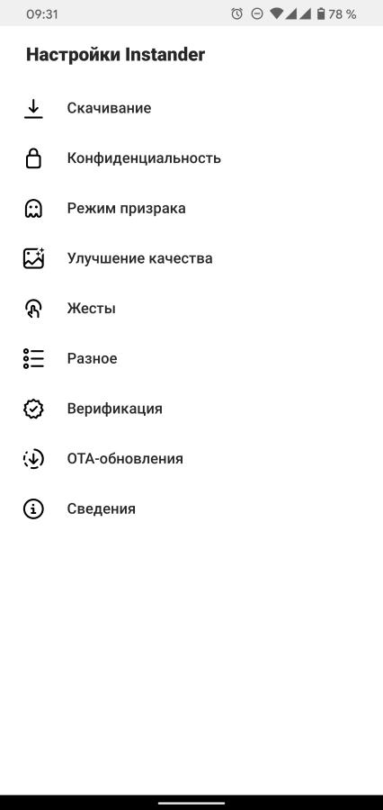 Про возможности Instander, как клиента Instagram, я рассказывать не буду. Приложение — клон официального клиента и на 100% дублирует все его возможности. А вот возможности мода активируются в настройках приложения.