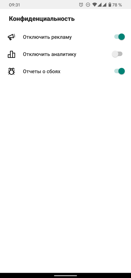 - Конфиденциальность помогает отключить рекламу и сбор аналитики;