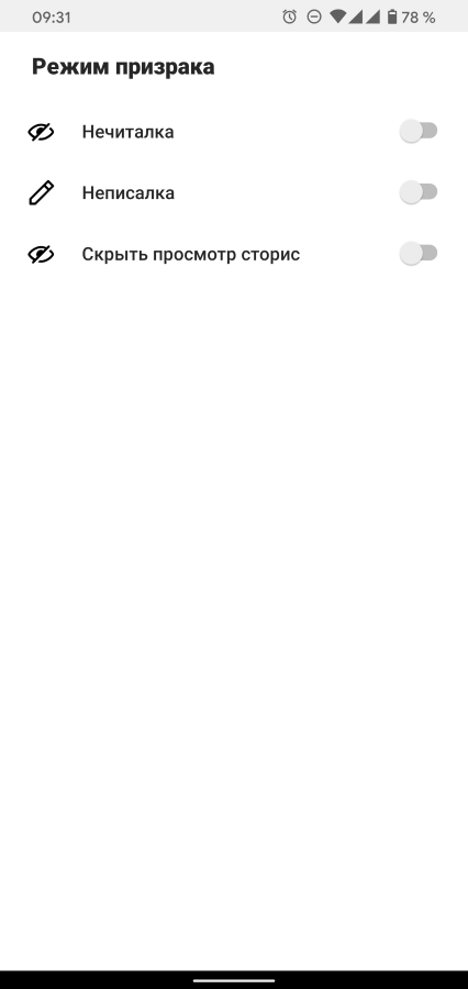 - Режим призрака скрывает статус прочтения постов, статус «пишет» и просмотр сториз;