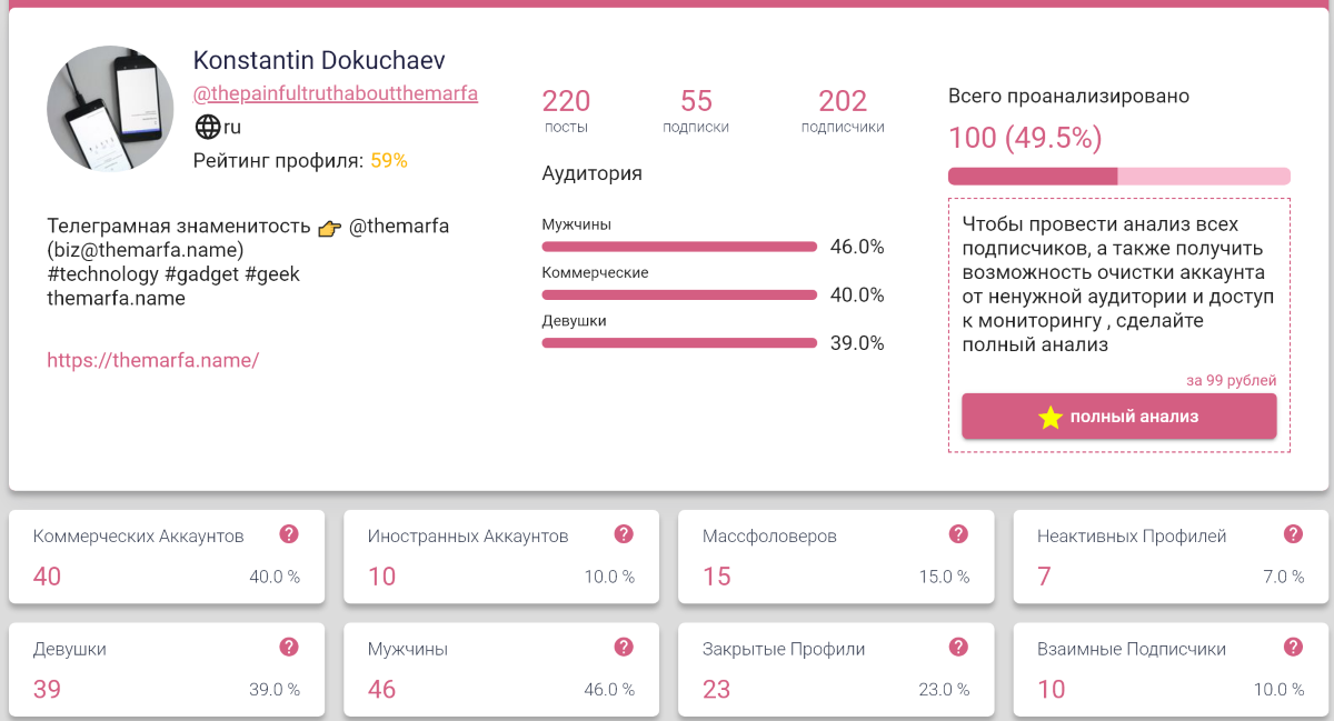 Быть скрытым самому это замечательно. А узнать всё про других ещё лучше. Поэтому можно воспользоваться специальными сервисами для анализа аудитории, вроде InstaHero. Они буквально за одно нажатие выдают такую информацию, как местоположение, пол и возраст ваших подписчиков, а также позволяют выявить ботов и мёртвые аккаунты.