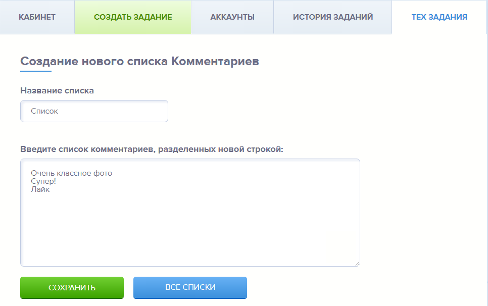 В Instaplus больше всего моё внимание привлекла вкладка «Тех. задания». Своим названием она может напугать некоторых, но на самом деле за ней скрываются уникальные возможности сервиса. Здесь вы можете указать списки инстаграм-аккаунтов, на которые направить работу сервиса. И самое интересное, создать списки с комментариями, которые вы хотите автоматически оставить под фоточками. Списков можно составить несколько и применять их вкупе с задачами по продвижению.