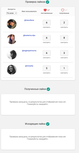 После чего при нажатии на кнопку Начать проверку Инсташпион запустит анализ аккаунта. В зависимости от объёма данных придётся подождать какое-то время. В это время будет лучше заняться своими делами, у меня анализ проходил достаточно долго. При этом даже спустя более чем 24 часа некоторые разделы остались пустыми. Подозреваю, что такие задержки связаны с API Instagram для избежания блокировки сервиса.
