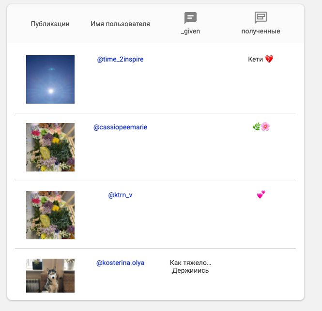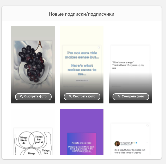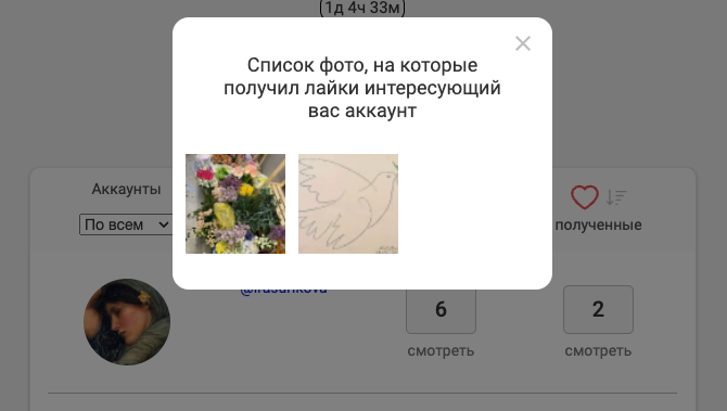 В этом разделе можно увидеть, кого лайкал пользователь и от кого лайки были получены. Есть фильтрация по аккаунтам и возможность просмотреть, какие конкретно изображения подверглись залайкиванию.