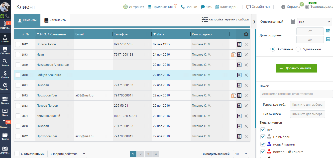 В системе можно вести «учёт» клиентов. Для каждого клиента можно завести карточку с его именем, контактами, а также указать — старый это клиент или он только обратился за вашими услугами.