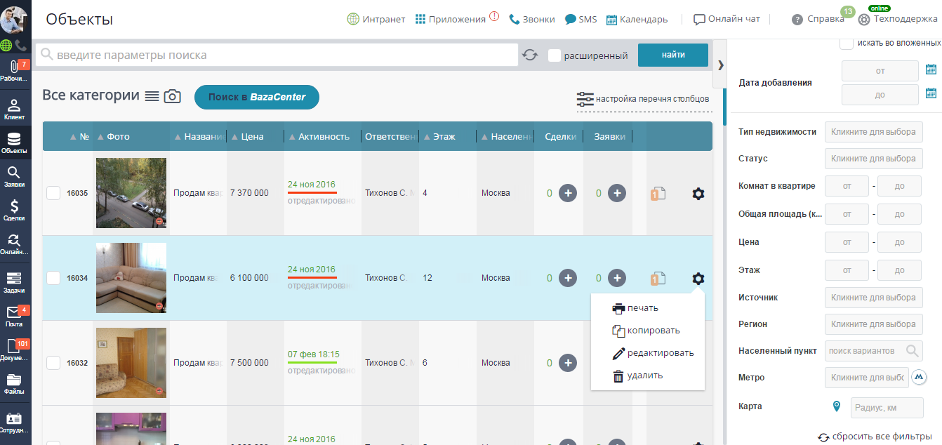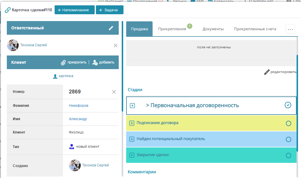 На любой объект в базе данных можно добавить ответственного сотрудника или создать задачу.