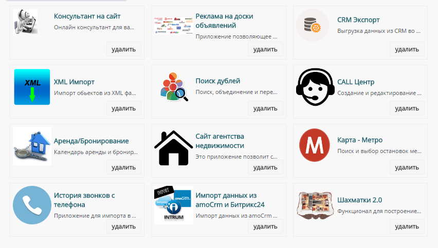 Функционал системы можно расширить при помощи приложений, которые устанавливаются одним нажатием кнопки. Для отраслей вроде недвижимости, туризма, автосалонов можно найти готовые приложения или выбрать одно из популярных.