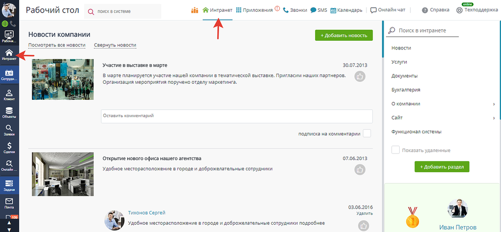 В INTRUM вы найдёте внутренний сайт, на котором сможете развернуть корпоративный портал. На нём сотрудники смогут не только оперативно получать новости компании, искать нужную информацию во внутренней базе знаний, но и общаться друг с другом. Права доступа к каждому разделу портала тонко настраиваются.