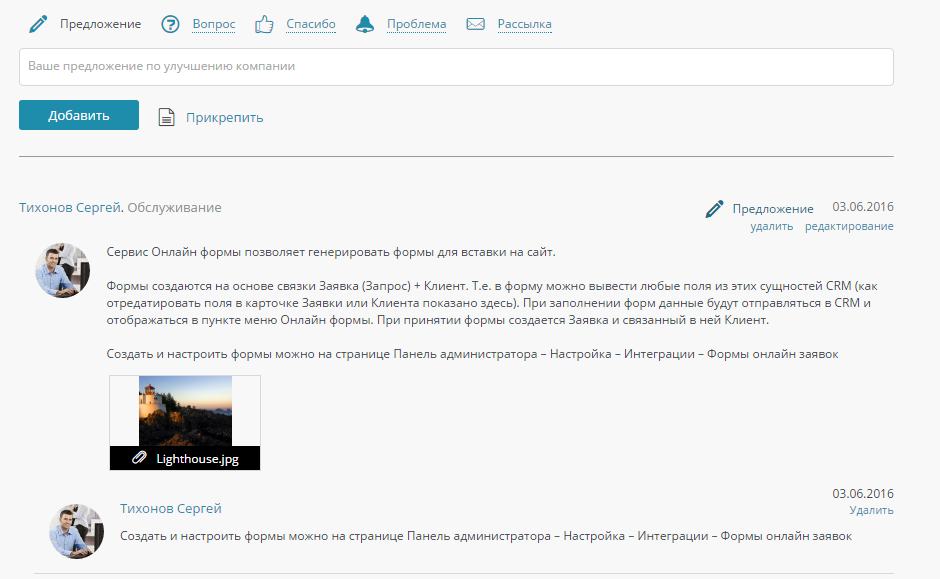 Создаваемые темы служат не только для донесения информации до сотрудников, но и точкой их обсуждения. Для каждой публикации можно добавить обсуждение, а сами публикации делятся на несколько типов: предложение, вопрос, проблема и тому подобное.