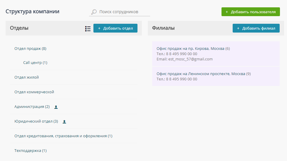 В специальном разделе HR-специалисты и другие сотрудники могут управлять структурой компании. Вы чётко будете понимать, в каком отделе работает каждый сотрудник, как с ним связаться. Сможете просмотреть карточку специалиста.