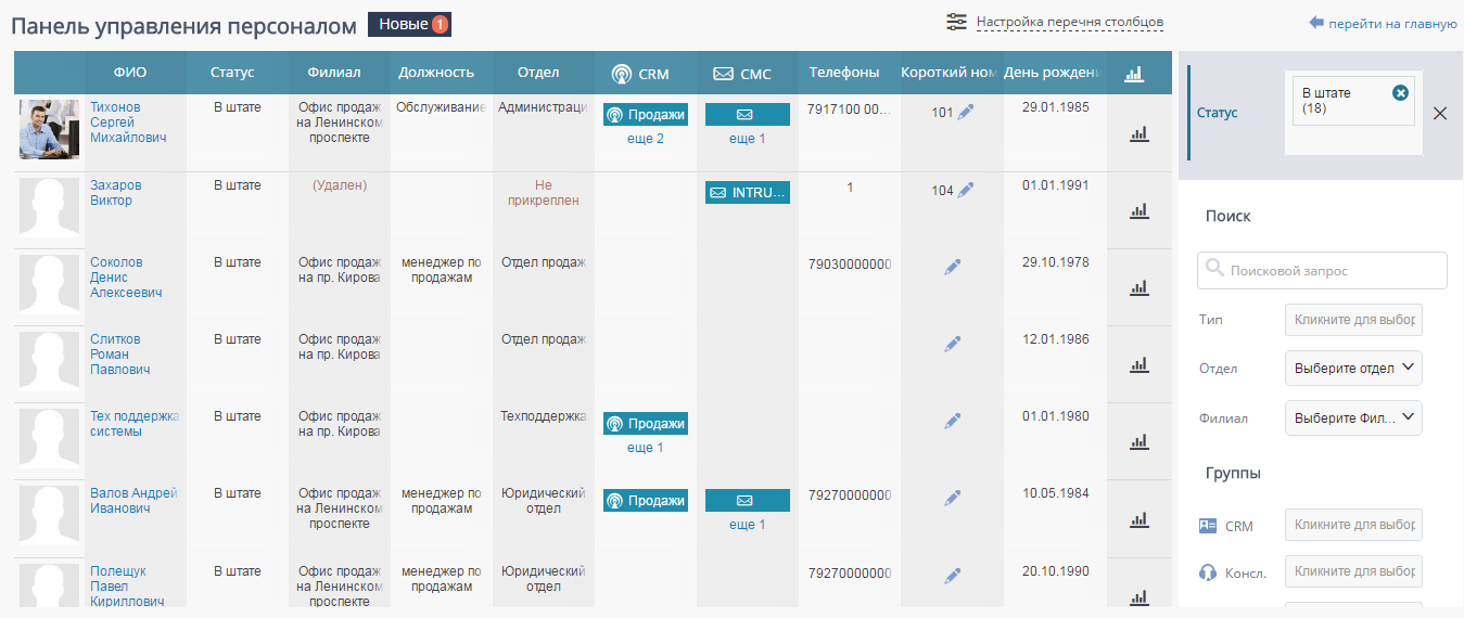 Управление пользователями осуществляется на специальной странице системы. На ней представлена сводная информация по каждому сотруднику, и отсюда легко быстро поменять основные данные работника.