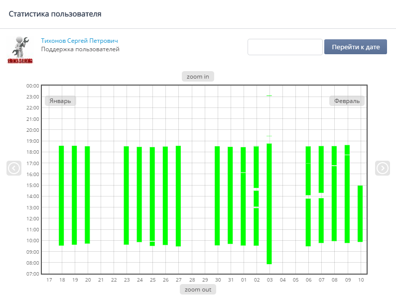 Также отсюда можно быстро перейти к графику работы персонала. График строится на основе данных о входе и выходе пользователя в INTRUM. Так можно автоматически отслеживать, во сколько был начат рабочий день, и когда человек ушёл домой или на обед.