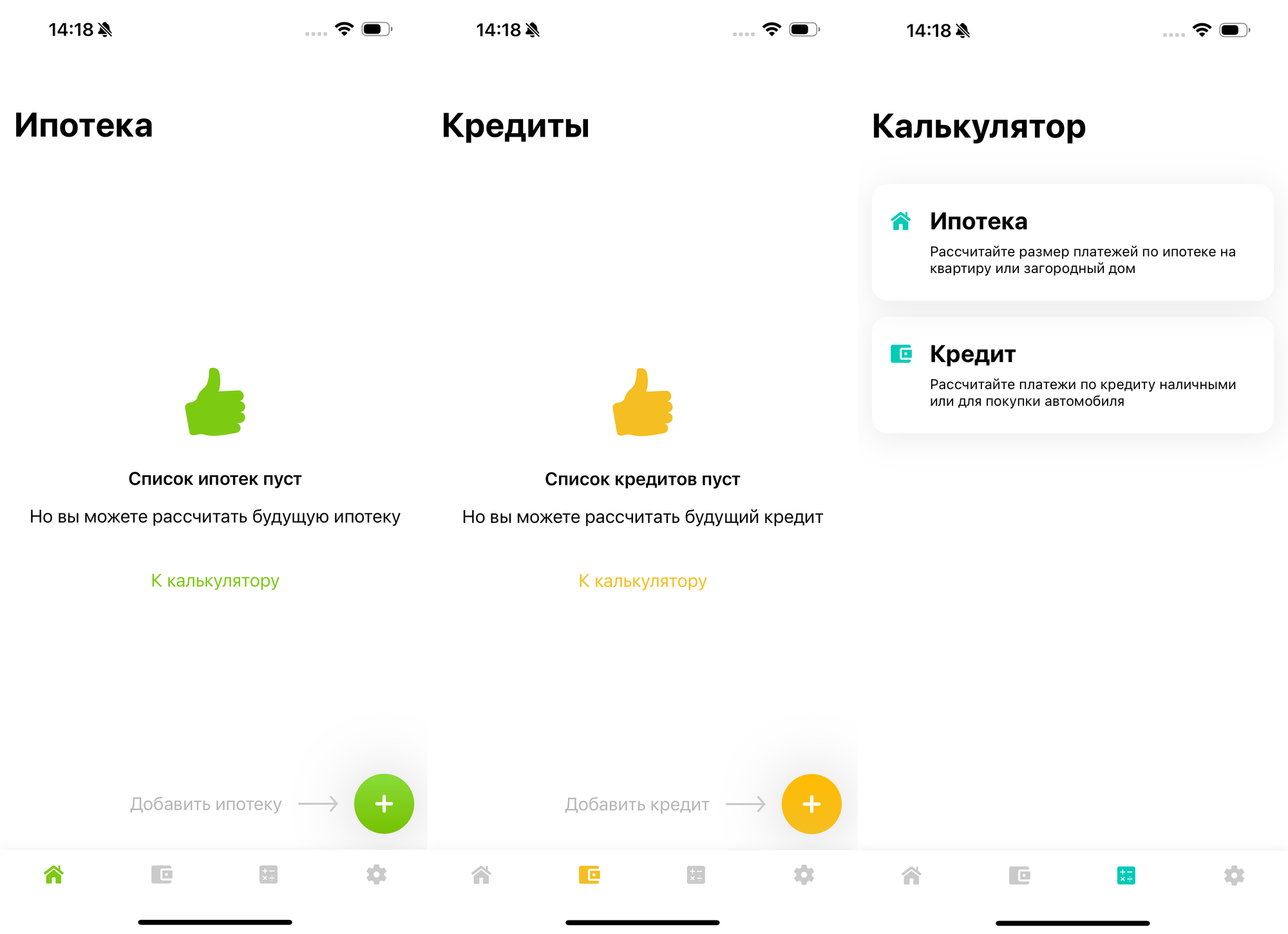 Всего у вас есть три важные вкладки: Ипотека, Кредиты и Калькулятор. Первые две вкладки работают практически идентично и позволяют добавить всю необходимую информацию об ипотеке или кредите, соответственно.
