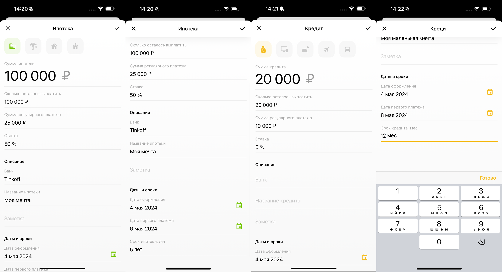 В зависимости от типа долга отличаются поля карточки, но в общих чертах всё одинаково. Нужно указать общую сумму долга, сумму регулярной выплаты, проценты, банк, название долга, срок окончания и дату следующей оплаты. Также можно выбрать одну из иконок для обозначения, на что же идут деньги. Ещё для ипотеки срок можно указать только в годах, а для кредита — в месяцах.
