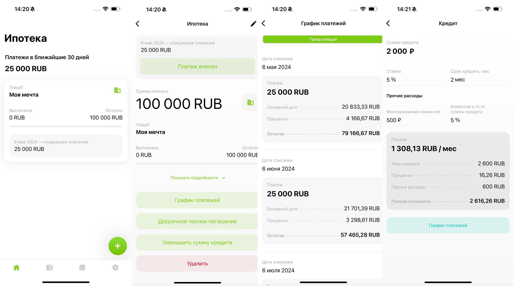 После чего в соответствующем разделе появится карточка с кратким описанием долга и общей суммой списаний в этом месяце. При переходе в карточку можно посмотреть даты и суммы будущих списаний, пометить ежемесячное списание выполненным и удалить запись. Также есть кнопки досрочного погашения и уменьшения процента, но на данный момент они не работают.