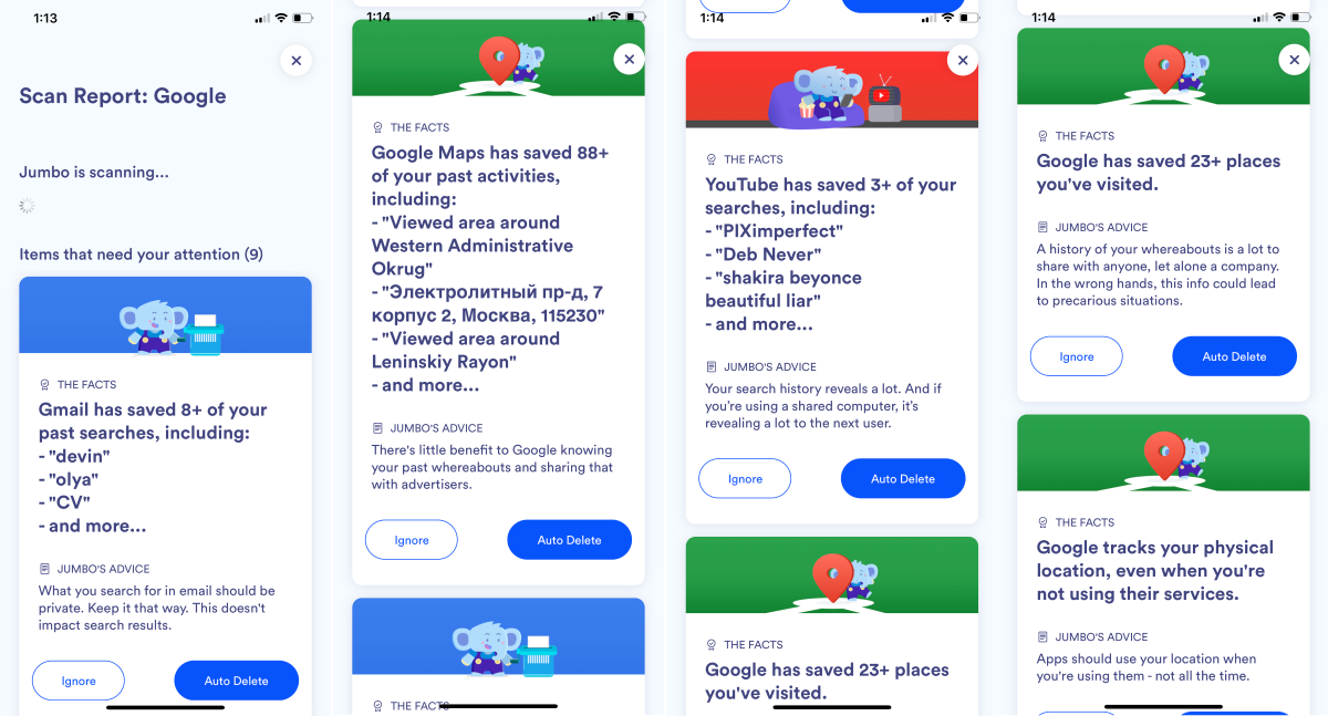 После окончания сканирования Jumbo отобразит карточки с данными, которые по вам собрала социальная сеть.