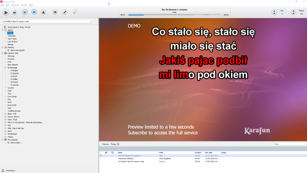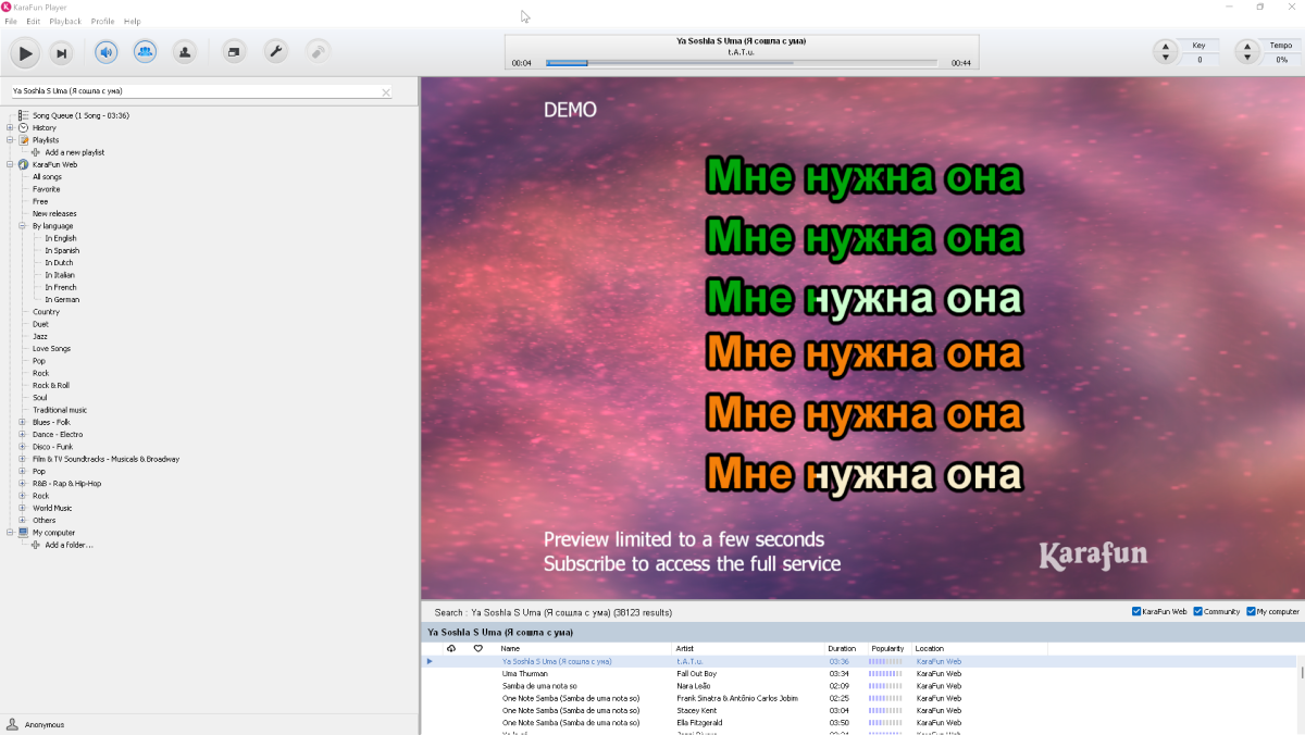 К сожалению, пользоваться полноценно KaraFun не получится на халяву. Есть несколько бесплатных треков, которым можно подпевать без регистрации и оплаты сервиса. В остальных случаях придётся заплатить.