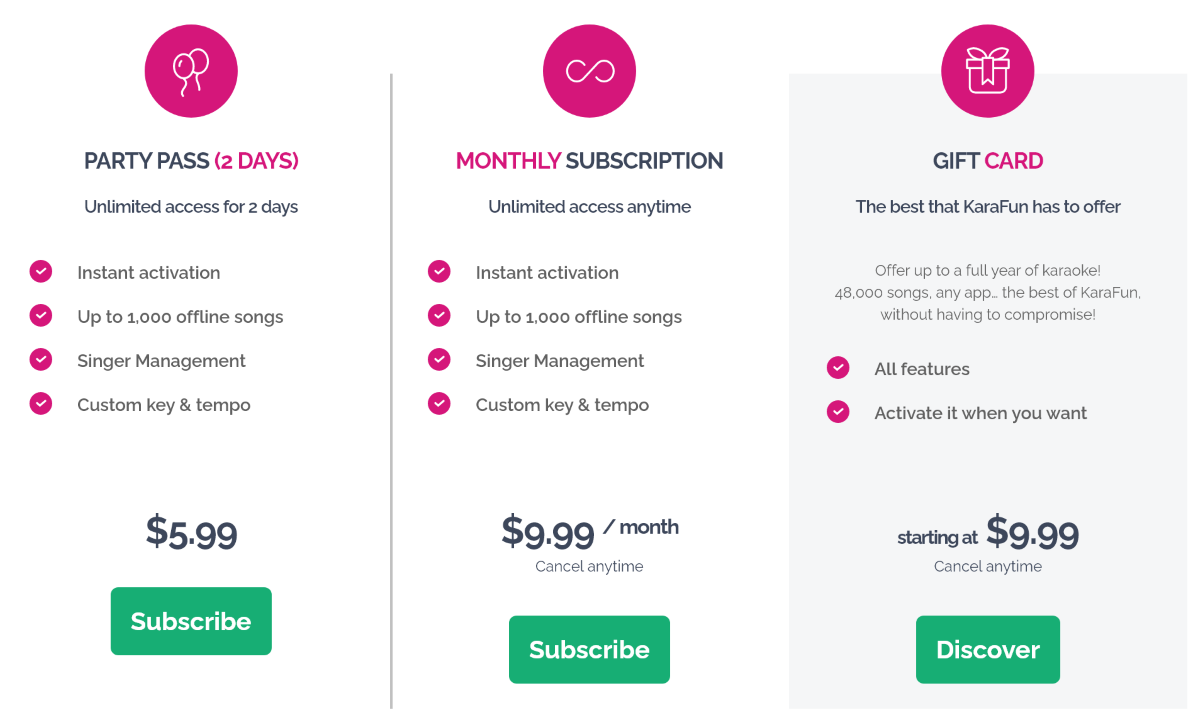 Подписка на два дня стоит $5.99, и это самый дешёвый тариф. Кроме доступа к библиотеке треков, он даёт возможность офлайн-работы, управление певцами, настройку тональности и темпа.