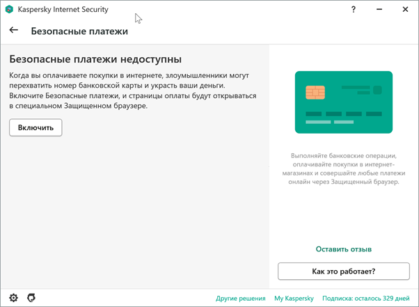 Удобная, если привыкнуть, возможность KIS. Если настройка активирована, то при попытке оплаты в сети будет запущена защищённая версия браузера. По сути это полностью изолированный браузер, который исключает утечку ваших платёжных данных.