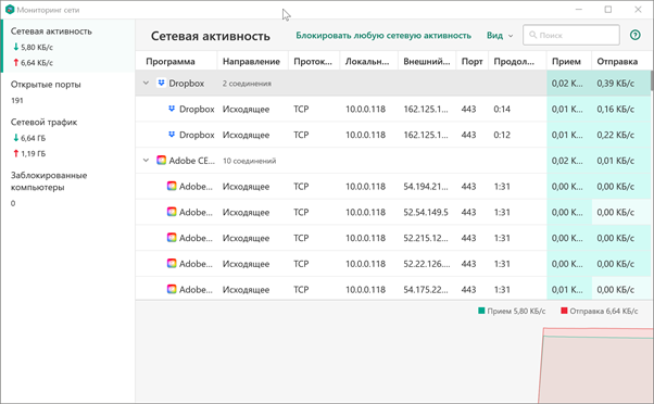 Мониторинг сети скрывает внутри фаервол. С его помощью прокачанный пользователь сможет тонко настроить поведение любых приложений и устройств в сети.