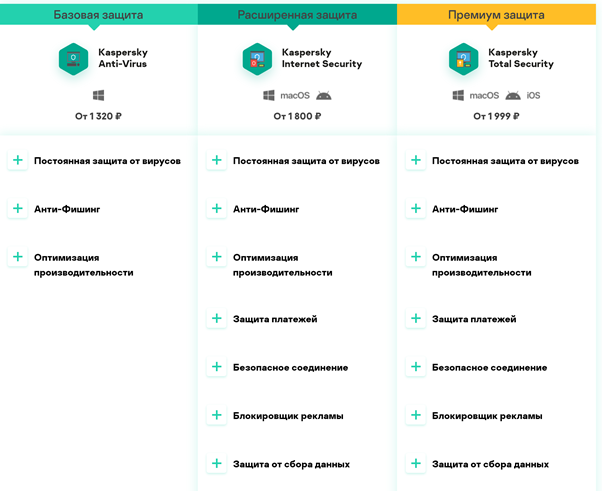 Цена на KIS зависит от редакции, количества устройств и срока лицензии. Если вам нужен только антивирус, то цена начинается от 1320 рублей в год. Комплексная защита без мобилок обойдётся от 1800 рублей в год. А самый максимум будет стоить от 1999 рублей.