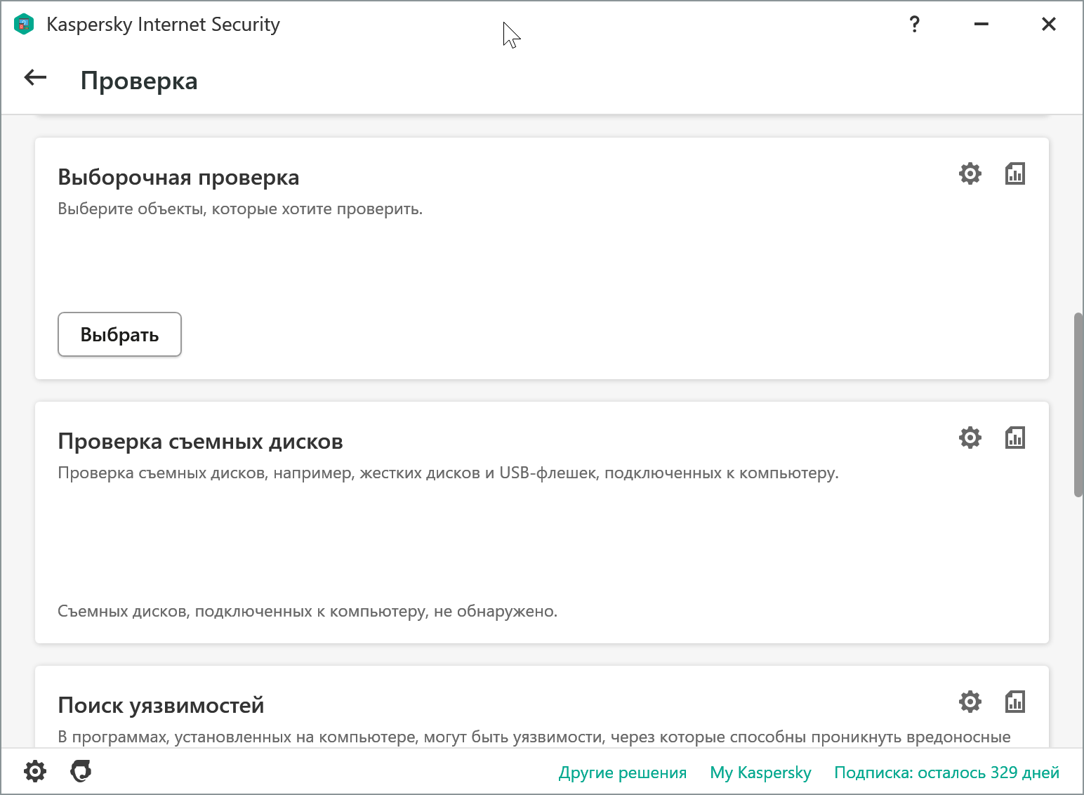 Проверка съёмных дисков проверит, соответственно, USB-диски, карты памяти и тому подобное. Эту проверку KIS может запускать автоматически при подключении таких устройств.