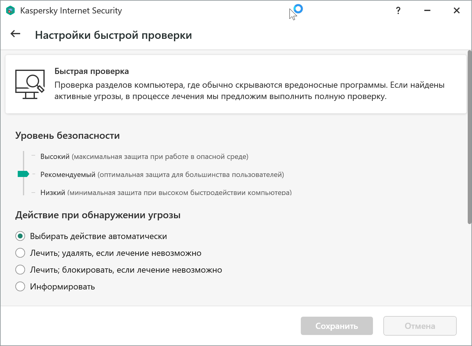 В Действиях при обнаружении угрозы можно настроить поведение KIS при обнаружении зловреда: автоматически вылечить, удалить или только информировать.