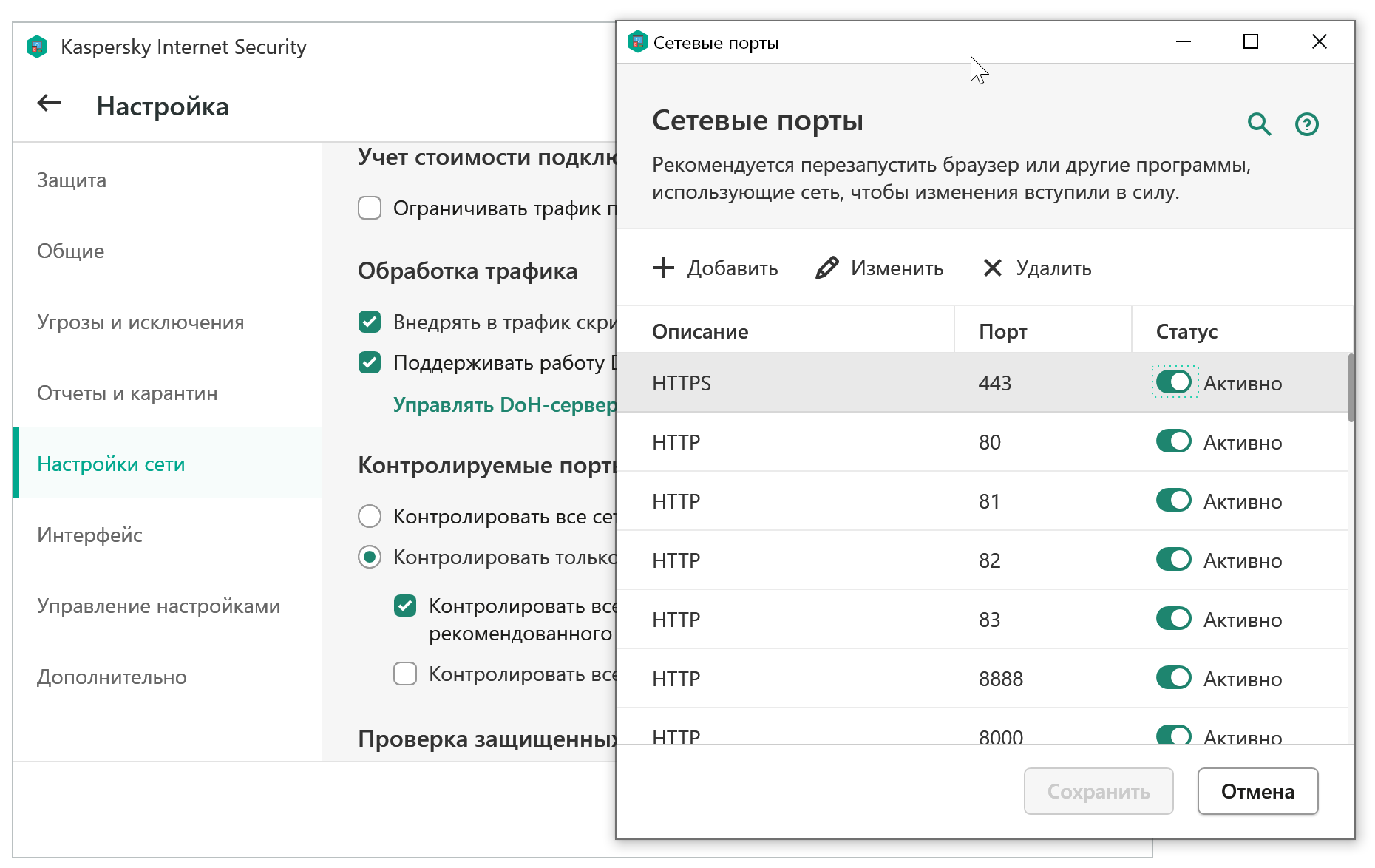 В Настройках сети указываются не только настройки Proxy-сервера, но и контроль трафика, портов и защищённых соединений.