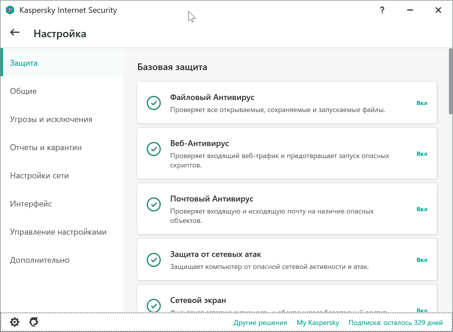 В разделе Защита можно включить те или иные компоненты KIS: файловый, веб и почтовый антивирусы, защиту от сетевых атак, сетевой экран, AMSI-защиту, анти-спам, анти-баннер и многое-многое другое.