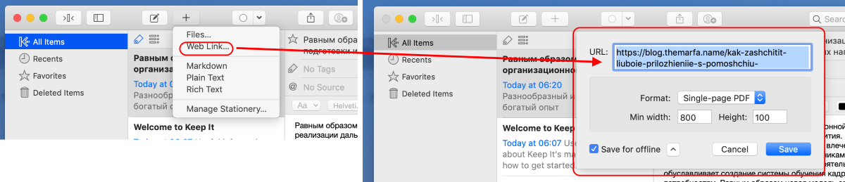 Как и Evernote, Keep It может сохранять веб-страницы. К сожалению, здесь это работает не так удобно.