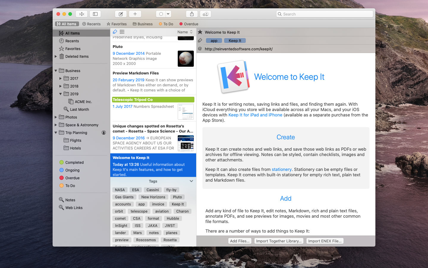 Keep It — ещё одна альтернатива Evernote и Notion для macOS и iOS. Здесь можно хранить заметки, идеи, ссылки, документы и многое другое. Поддерживается импорт из Evernote и Together.