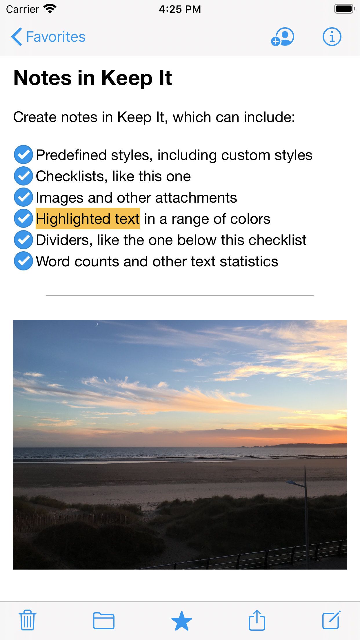 Папками и самими заметками можно делиться с другими пользователями Keep It через тот же iCloud. Благодаря чему можно организовать совместную работу.