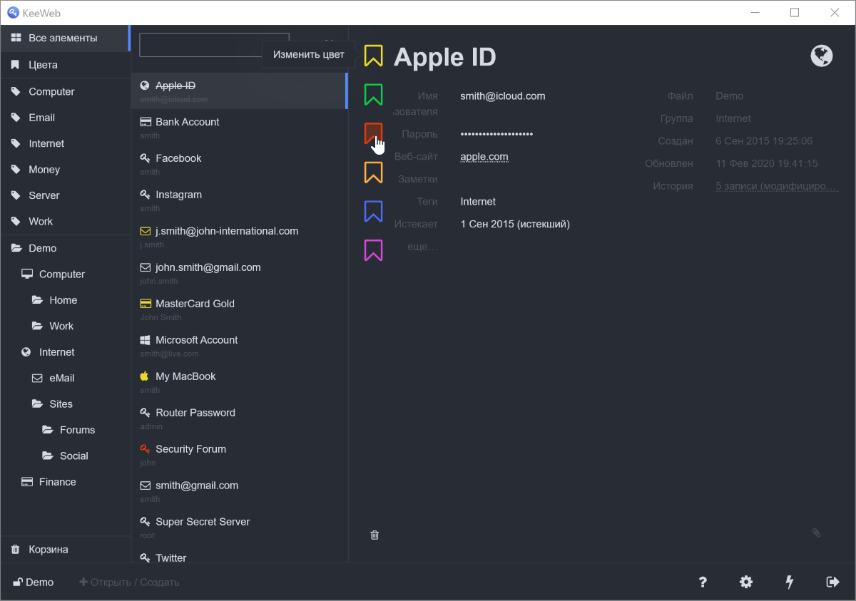 Для более удобной навигации каждому из паролей можно задать одну из шести цветовых меток. При клике на такую метку откроется вся группа паролей, привязанных к ней.