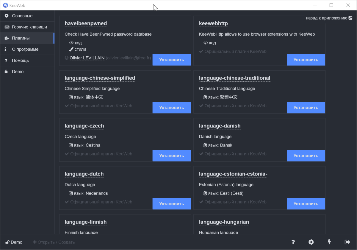 Русский язык в KeeWeb есть, устанавливается с помощью плагинов. Да, здесь есть плагины, о которых я расскажу ниже.